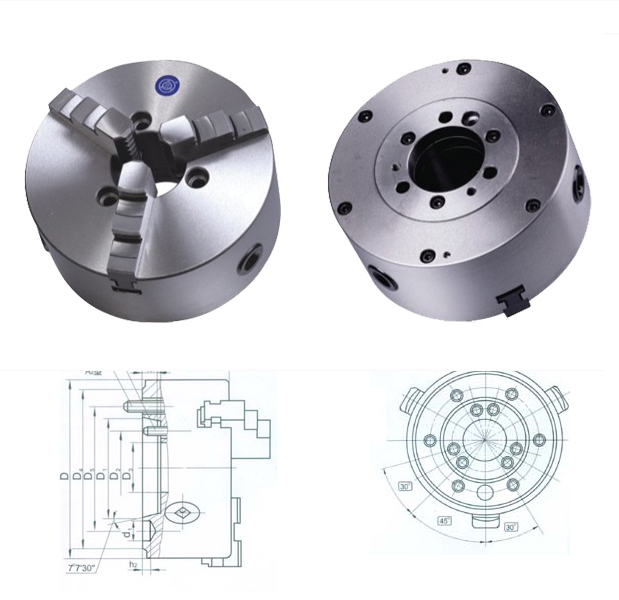 三爪自定心卡盤A2型(外圈穿通螺釘連接)采用短圓錐孔定位,定位精度高,拆裝快捷、方便、可靠。按其與機床主軸端部連接形式分為A型(穿通螺釘連接)、C型(拔盤、螺栓鎖緊連接)、D型(拉桿、凸輪鎖緊連接)三種型式。
