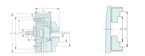 該產(chǎn)品是為成批或大量生產(chǎn)的經(jīng)濟(jì)型數(shù)控機(jī)床、專用機(jī)床、卡盤車床、六角車床及普通車床配套的三爪無通孔動(dòng)力卡盤。配套油缸為P22型無通孔回轉(zhuǎn)油缸。可根據(jù)用戶要求配置軟卡爪。